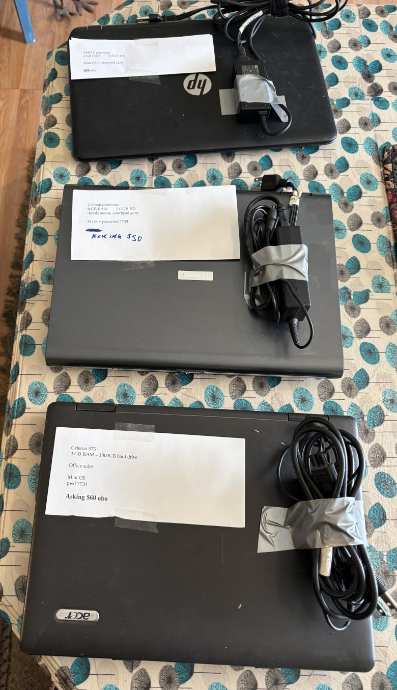 Area250 Computers has wiped old user data, done fresh OS installs and tested these laptops before donating them. You can pick them up for les than your time is worth to dosnload and install Linux on your own computer. Working chargers incluses.